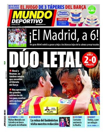 Jornal ''Mundo Deportivo'' classifica Neymar e Messi como dueto letal (Foto: Reprodução)O jornal ''Mundo Deportivo'' classificou a parceria da equipe catalã como um ''Dueto Letal'' em sua capa deste domingo. De acordo com a edição, juntos, o brasileiro e o argentino ajudaram a consolidar o Barcelona na liderança do Campeonato Espanhol.
