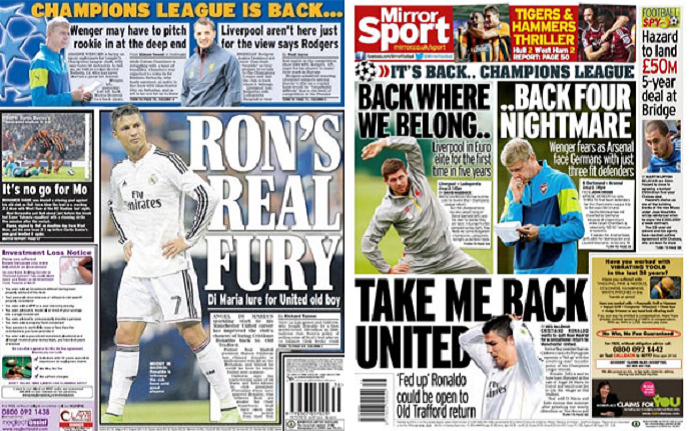 Jornais tratam do possível retorno de CR7 ao United (Foto: Reprodução)
