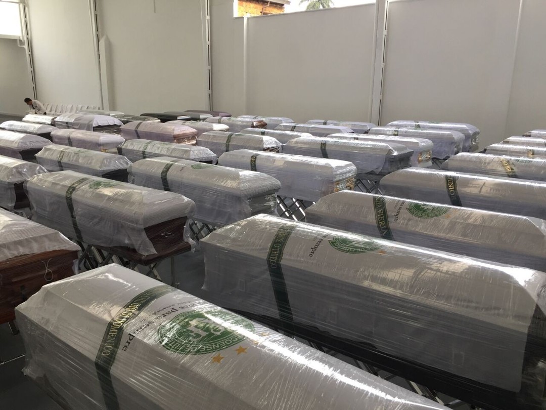 Caixões lacrados na funerária à espera do transporte rumo a Chapecó, onde acontecerá o velório coletivo das vítimas, na Arena Condá, na manhã deste sábado.